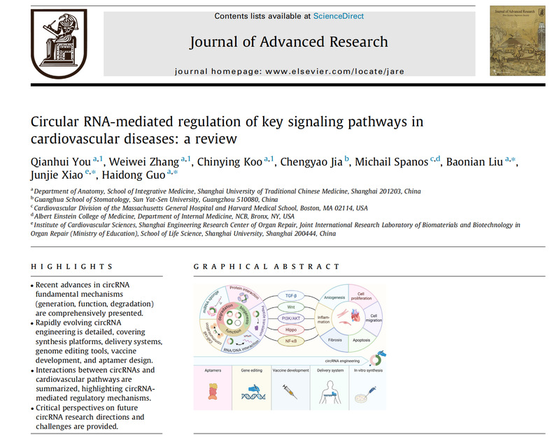 近日,我校成人视频 国海东教授团队、刘宝年团队联合上海大学肖俊杰教授团队,在国际知名学术期刊Journal of Advanced Research发表题为“Circular RNA-mediated regulation of key signaling pathways in cardiovascular diseases: a review”的论文,总结了环状RNA的生命周期、工程学应用潜力,以及其在调控心血管疾病核心信号通路中的研究现状,为该领域研究提供参考的同时,也针对当前心血管疾病治疗面临的分子机制瓶颈,探讨了基于环状RNA的未来探索方向。