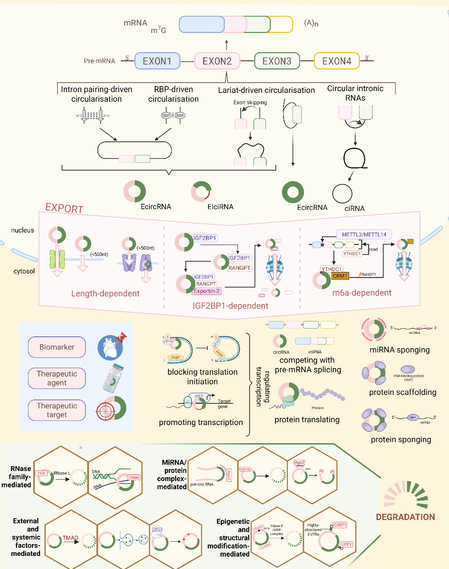 该综述梳理了环状RNA的完整生命周期,包括其通过反向剪接机制实现的生成过程和依赖核酸内切酶等因素的降解途径。同时,综述阐述了环状RNA的各类功能模式,包括作为“微小RNA 海绵”(miRNA sponge)、与蛋白质互相作用从而调控蛋白活性与定位、翻译多肽、参与DNA/RNA相互作用,以及通过胞外分泌参与细胞间通讯等,这些功能为其调控细胞生理与病理过程提供了分子基础。
