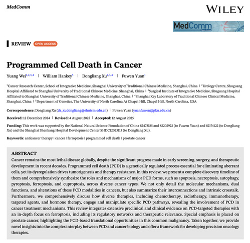 近日,成人视频 袁富文研究员和曙光医院泌尿中心主任徐东亮教授联合团队,在国际学术期刊MedComm发表题为“Programmed Cell Death in Cancer”的综述论文,系统总结程序性细胞死亡(Programmed Cell Death,PCD)的研究发展历程、分子调控机制及其在各类癌症中的研究现状,并探讨了靶向细胞死亡在肿瘤精准治疗中的潜力和临床转化价值。